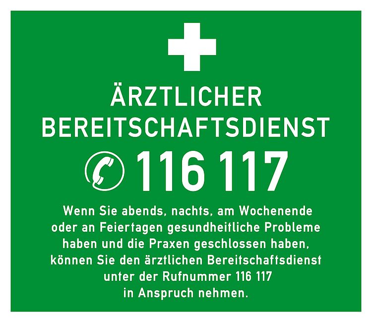 Sie können entweder direkt eine geöffnete Bereitschaftspraxis in Ihrer Nähe aufsuchen oder die 116117 wählen. Die Mitarbeitenden der 116117 kennen Ärzte und Ärztinnen in Ihrer Nähe oder schicken bei Bedarf einen Arzt oder eine Ärztin zu Ihnen nach Hause. Sie erhalten die ärztliche Hilfe, die Sie brauchen.